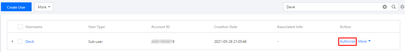 1. 企業アカウント CompanyExample を使用して、CAMコンソールにログインします。 2. カスタムサブユーザー作成を使用して、ユーザー名がそれぞれ DevA と DevB の2つのサブアカウントを作成します。 3. ユーザーリストページで、先ほど作成したサブアカウント DevA を検索して見つけ、右側の操作列にある権限付与をクリックします。下図の通りです: