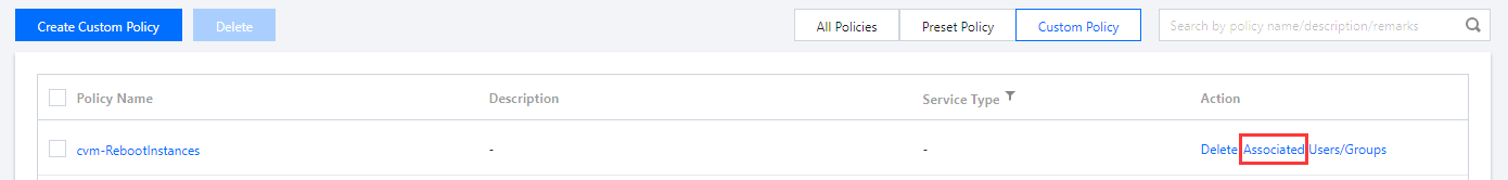 ポリシー名称:デフォルトは policygen-現在の日付となり、重複しない意味のあるポリシー名を独自に定義することをお勧めします。例えば、 cvm-RebootInstancesなどです。