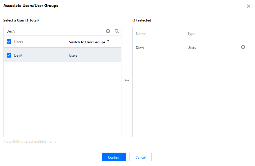 7. ポップアップしたユーザー/ユーザーグループ関連付けウィンドウで、サブアカウント DevA を検索してチェックを入れ、確定をクリックして権限付与操作を完了します。