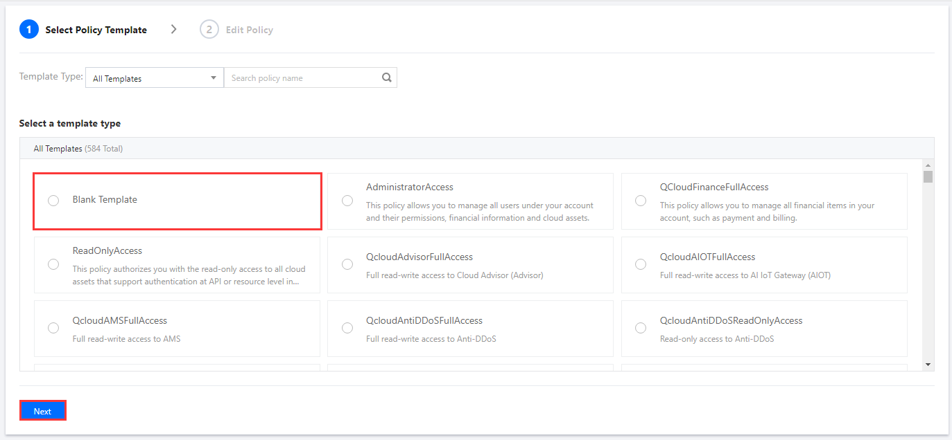 1. 企業アカウント CompanyExample を使用して、CAMコンソールにログインします。 3. モジュールタイプ選択で空白テンプレートを選択し、次へをクリックし、ポリシー編集ページに移動します。