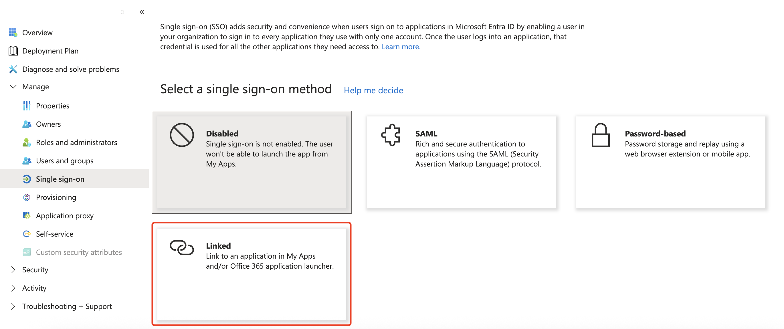 4. シングルサインオン方式をリンク形式として選択します。以下の図の通りです: