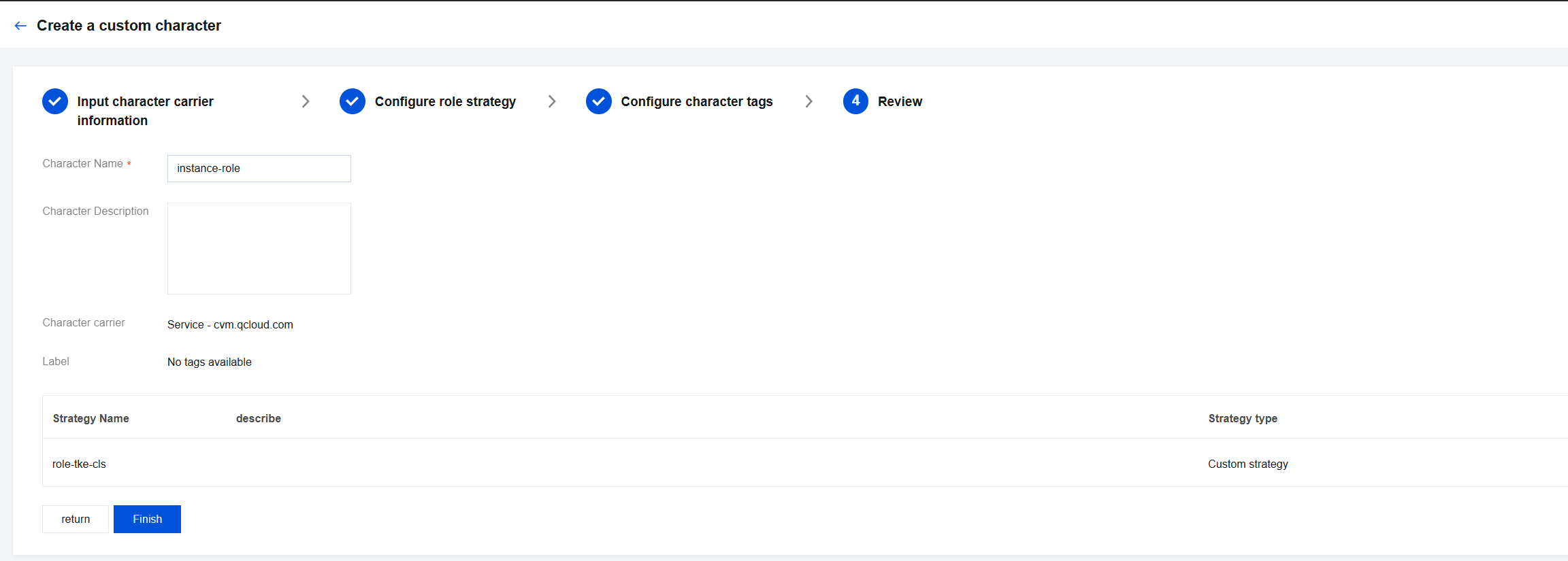 (1)Tencent Cloudコンソールに移動し、CAM > ロール ページに進みます。 (2)新規ロール作成をクリックし、カスタムロール instance-role を作成します。