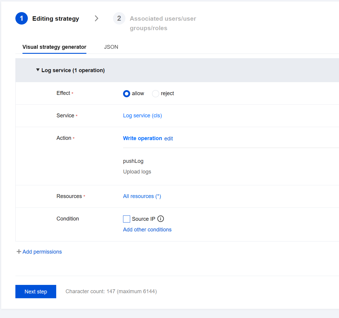 (3)ログのアップロードを許可するカスタムポリシーを作成します(注記:シナリオに応じて、ロールに異なるポリシーを付与できます)。