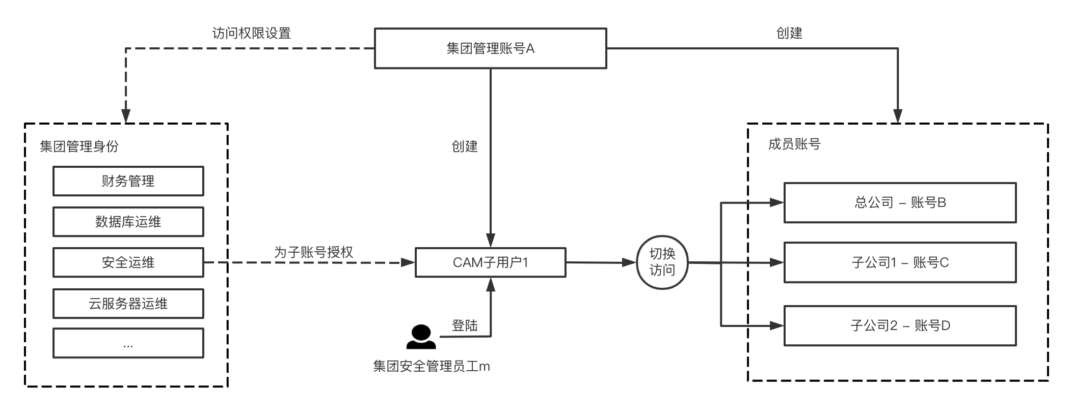 あるグループがTencent CloudにアカウントAとアカウントBを持っておりと仮定し、アカウントAを管理アカウントとして選択し、アカウント管理プロダクトを開通します。グループ内には子会社1と子会社2があり、それぞれアカウントCとアカウントDを持っています。グループ内にはセキュリティ管理者である従業員mがおり、グループおよびその子会社のアカウントを同時に運用保守管理したいと希望しています。