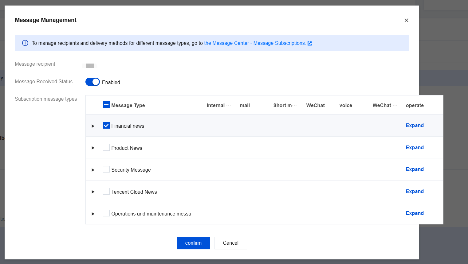 4. ポップアップ表示されたメッセージ管理ページで、メッセージ受信状態右側のをクリックし、有効に設定後、必要に応じてサブスクリプションメッセージタイプを選択し、確認をクリックします。