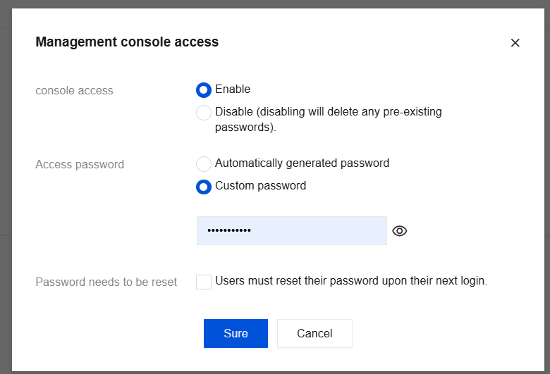 3. ユーザー詳細ページ内のセキュリティ > コンソールログイン設定 > コンソールアクセス右側のをクリックします。 4. 表示された管理コンソールアクセスページで、有効化を選択し、必要に応じて関連情報を選択します。以下の図のように: