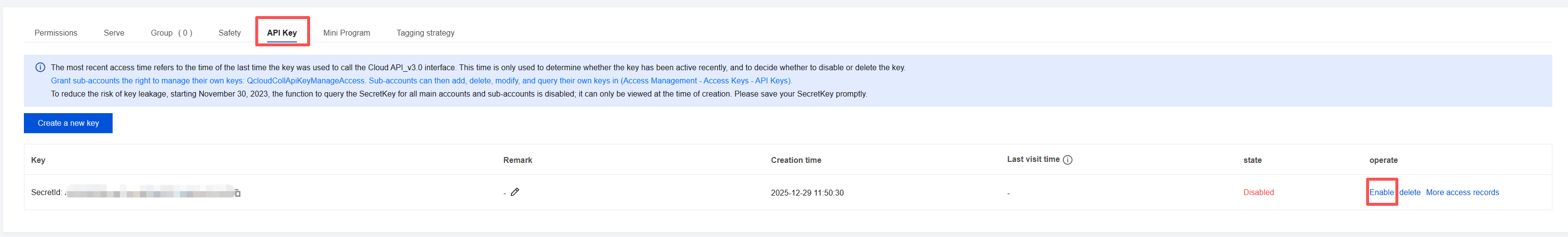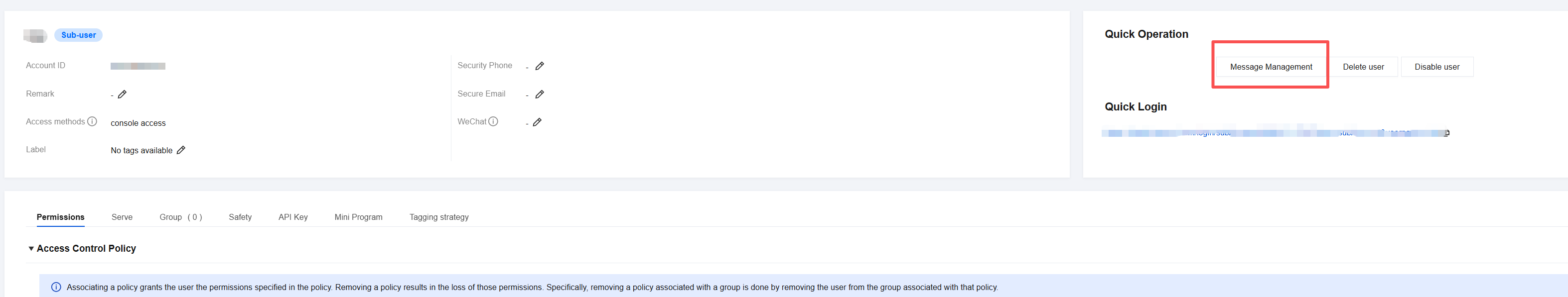 本ドキュメントは、無効化されたサブユーザーを有効化する方法を紹介します。三つの無効化された権限を一つずつ有効化した後、ユーザーは再びサブユーザーを通じてコンソールにログインまたはプログラミングアクセスで当該アカウント内のリソースにアクセスでき、かつメッセージを再受信できます。このユーザーを再び無効化したい場合は、サブユーザーの無効化を参照して再び無効化してください。 前提条件