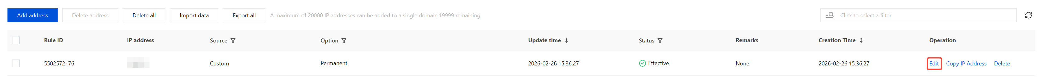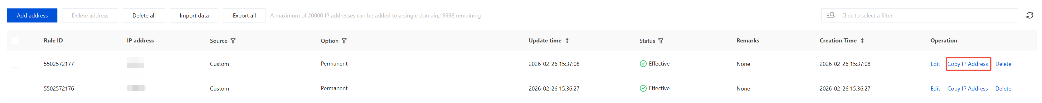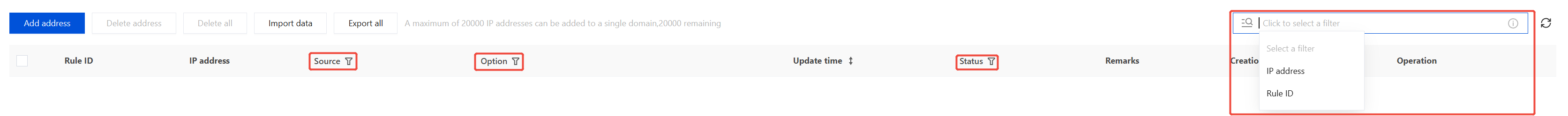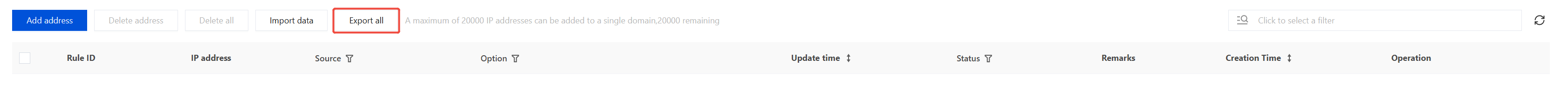 1. On the Allowlist/Blocklist page, select the domain name to be protected in the upper-left corner, and click IP Allowlist. 2. On the IP Allowlist page, click the search box and enter IP address or Rule ID to filter IP addresses. Alternatively, click the Source, Option, Status fields to filter IP addresses based on corresponding criteria. 3. After the required IP addresses are filtered, click Export all to export the required IP filtering results.