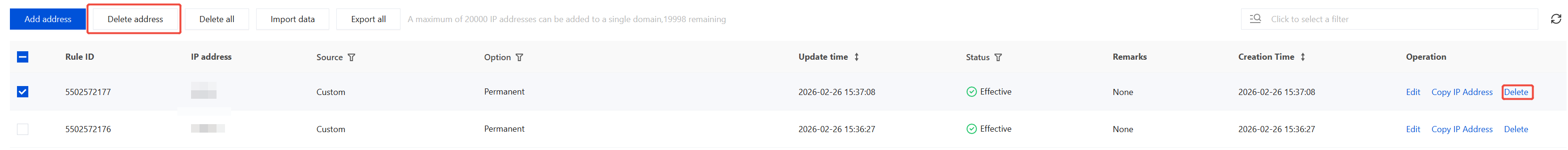 Single: Select a single IP address, click Delete address or Delete in the operation column, and a Confirm Deletion pop-up window will appear.