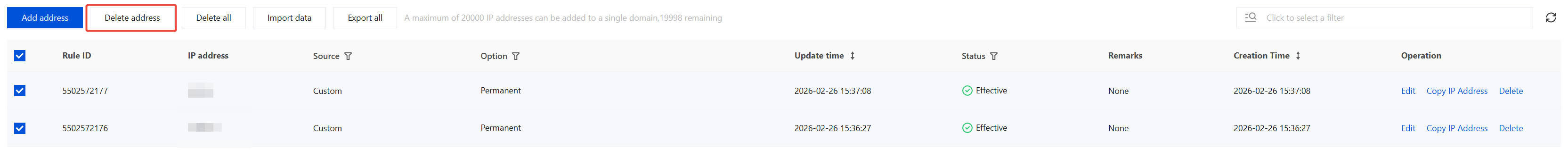 This operation will clear all IP address allowlist information under the current domain name. Please exercise caution! The deleted information cannot be recovered and must be re-added to take effect.