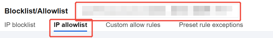 1. On the Allowlist/Blocklist page, select the domain name to be protected in the upper-left corner, and click IP allowlist. 2. On the IP Allowlist page, select the required IP address, click Copy IP Address in the operation column to copy it to the clipboard.