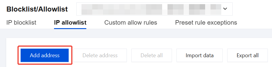 1. On the Allowlist/Blocklist page, select the domain name to be protected in the upper-left corner, and click IP allowlist. 2. On the IP Allowlist page, you can delete a single address, partial addresses, or all addresses. Specific operations are as follows: