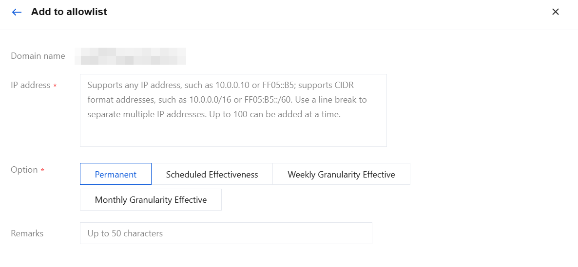 When the selected domain name is Global, the IP address or IP range will be added to the global allowlist.