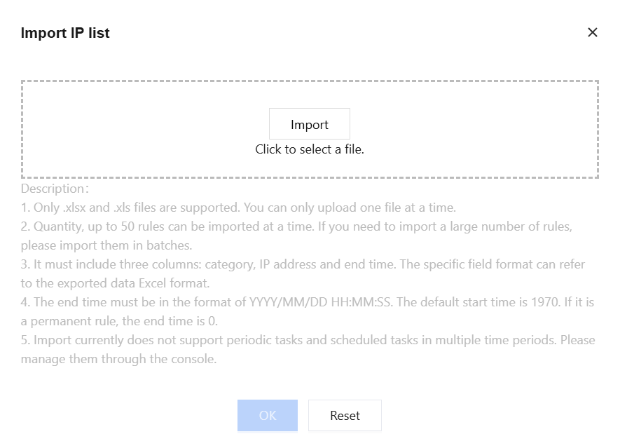 1. On the Allowlist/Blocklist page, select the domain name to be protected in the upper-left corner, and click IP allowlist. 2. On the IP Allowlist page, click Import data > Import. After the data is parsed successfully, click OK.