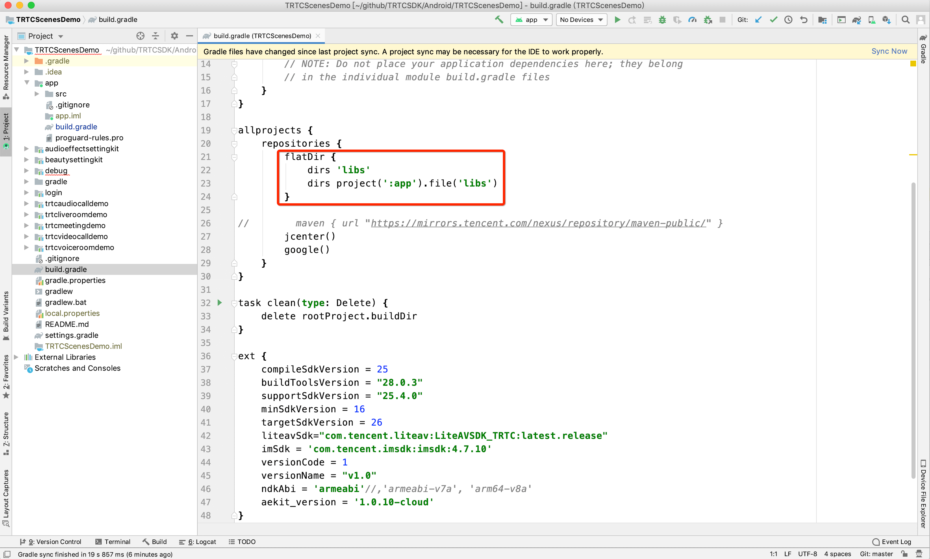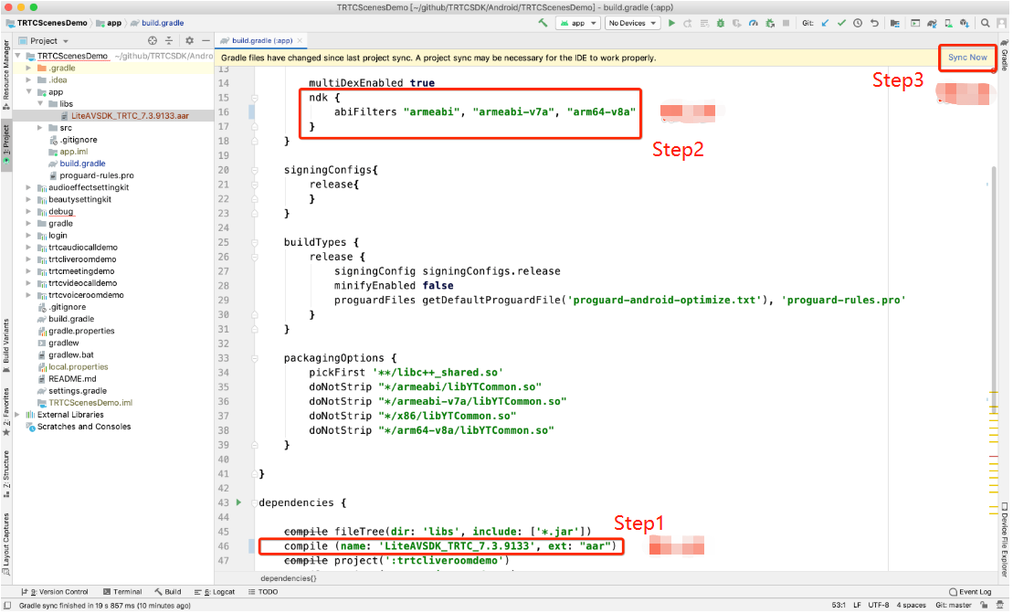 dependencies{implementation 'com.tencent.liteav:LiteAVSDK_TRTC:latest.release'}