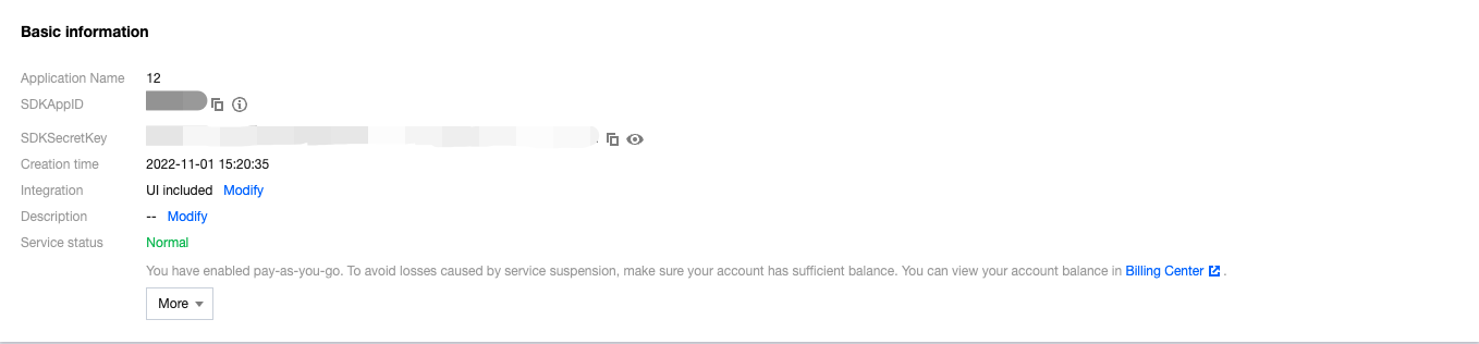 1.2 アプリケーション設定をクリックし、SDKAppIDに対応するアプリケーション情報を確認します。
