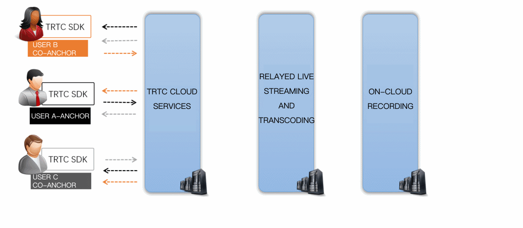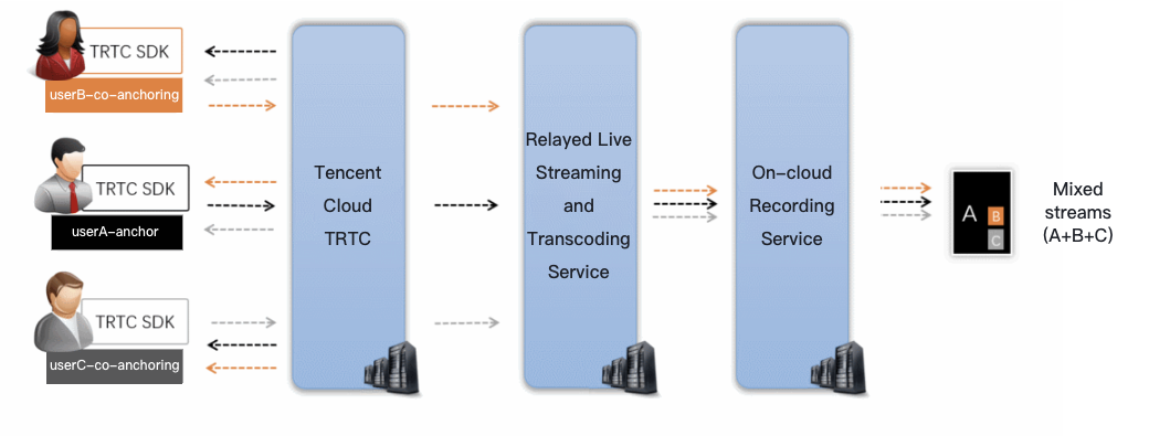 TRTC SDKが提供するいくつかのAPIインターフェースとパラメータを呼び出すことで、クラウドミクスストリーミング、クラウドレコーディング、Relayed live streamingの3つの機能を実装できます。