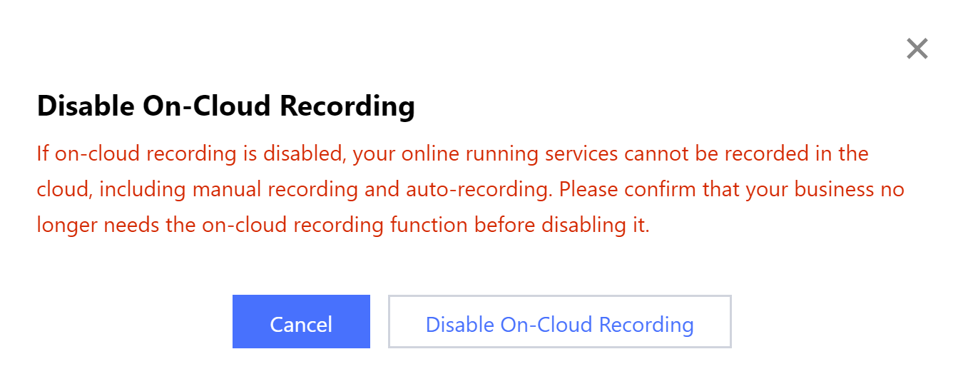 クラウドレコーディングをオフにすると、オンラインで手動レコーディングや自動レコーディングなどのクラウドレコーディングを実行できなくなります。オフにする前に、業務でクラウドレコーディングが不要であることを確認してください。