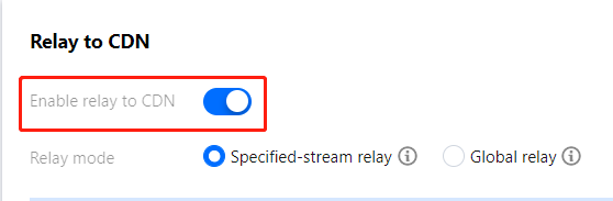 Relayed Push用指定ストリーム:「Relayed Push用指定ストリーム」の選択後、ミクスストリーミングトランスコードが不要な場合は、クライアントSDK startPublishingのインターフェースを呼び出して、直接Relayed Pushを起動させてください。ミクスストリーミングトランスコードが必要な場合は、Cloud MixTranscodingのドキュメントのガイド操作に従ってください。ミクスストリーミングトランスコーディング後にAuto-Relayed Pushが実行されます。 Global Auto-relay:「Global Auto-relay」を選択すると、すべてのTRTCのアップストリームのオーディオビデオストリーミングはCSSシステムにAuto-Relayed Pushされます。