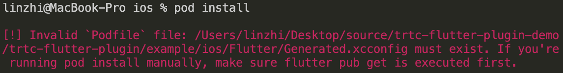 エラーメッセージの中に pod install 時に generated.xconfigファイルがないと表示され、このため実行エラーとなっています。解決には表示のとおりにflutter pub getの実行が必要 です。 説明: