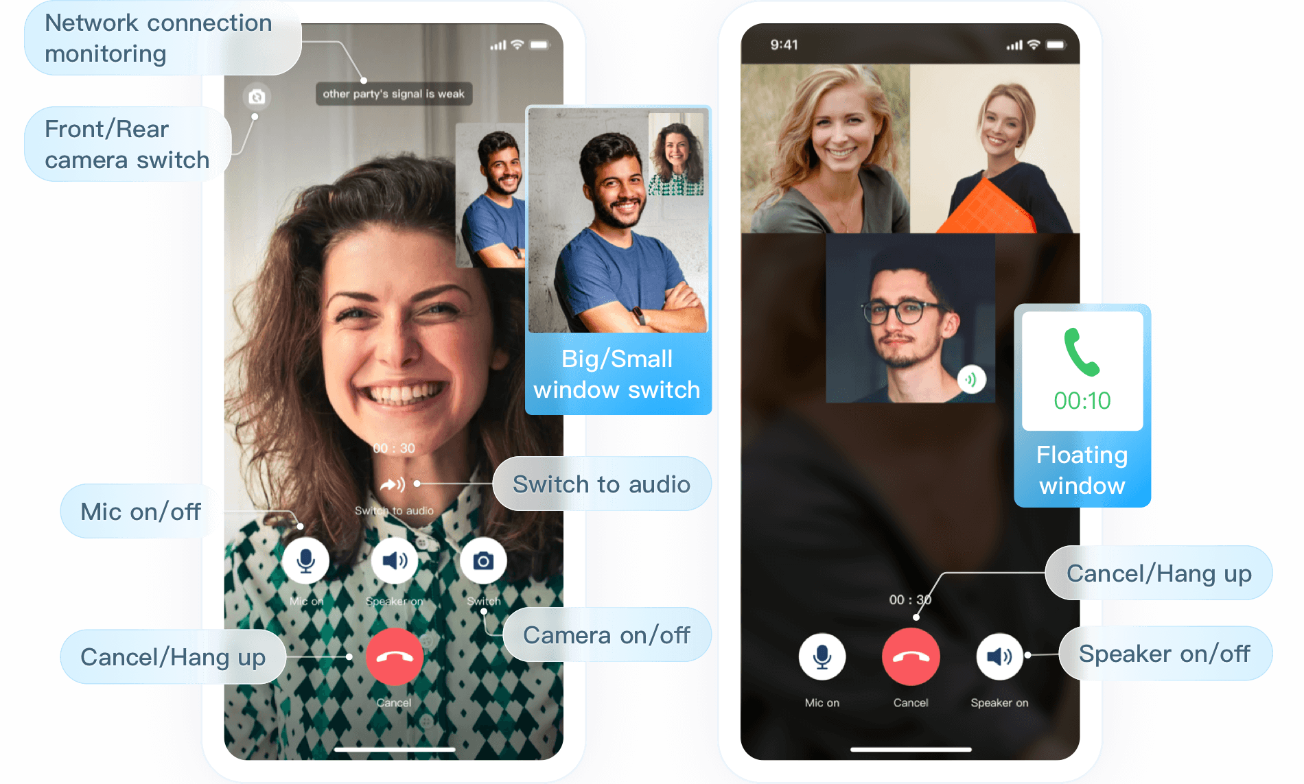 2人または複数人のオーディオビデオ通話が行えます。ゲームSNS、オンラインカスタマーサービス、ビデオカスタマーサービス、オンライン問診、保険相談などのシーンに適します。