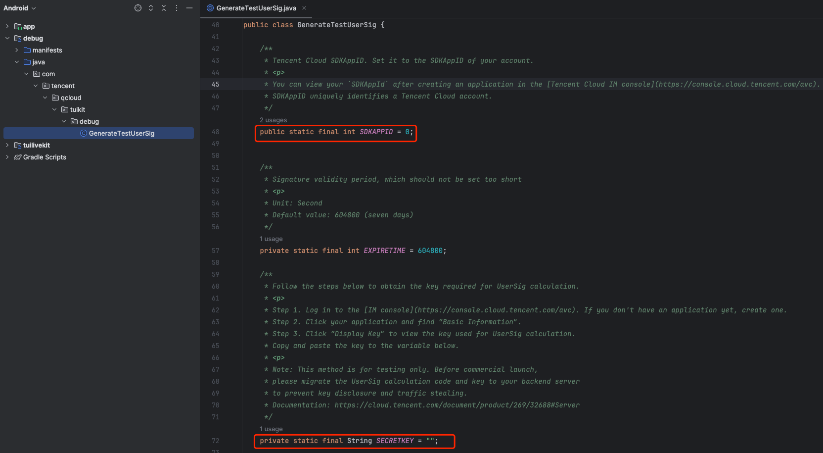 Android/debug/src/main/java/com/tencent/qcloud/tuikit/debug/GenerateTestUserSig.javaファイルを開き、サービスをアクテイブ化する時に取得した SDKAppID と SDKSecretKey を入力します。