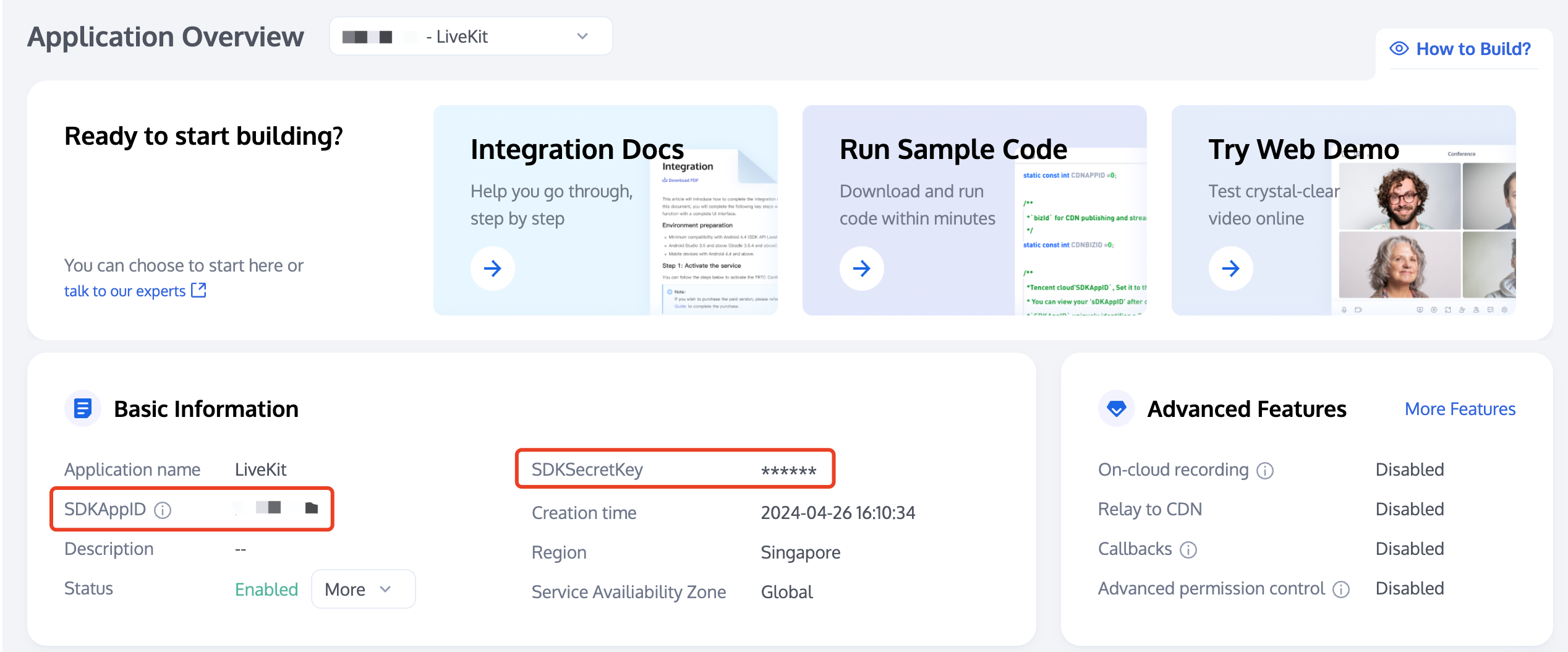 SDKAppID と SDKSecretKey** を取得します。