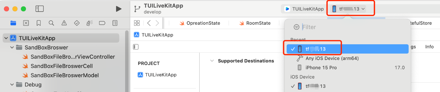 1. TUILiveKit/iOS/Example/TUILiveKitApp.xcworkspace プロジェクトを開き、下図のように XCode で実行するデバイスを選択します。