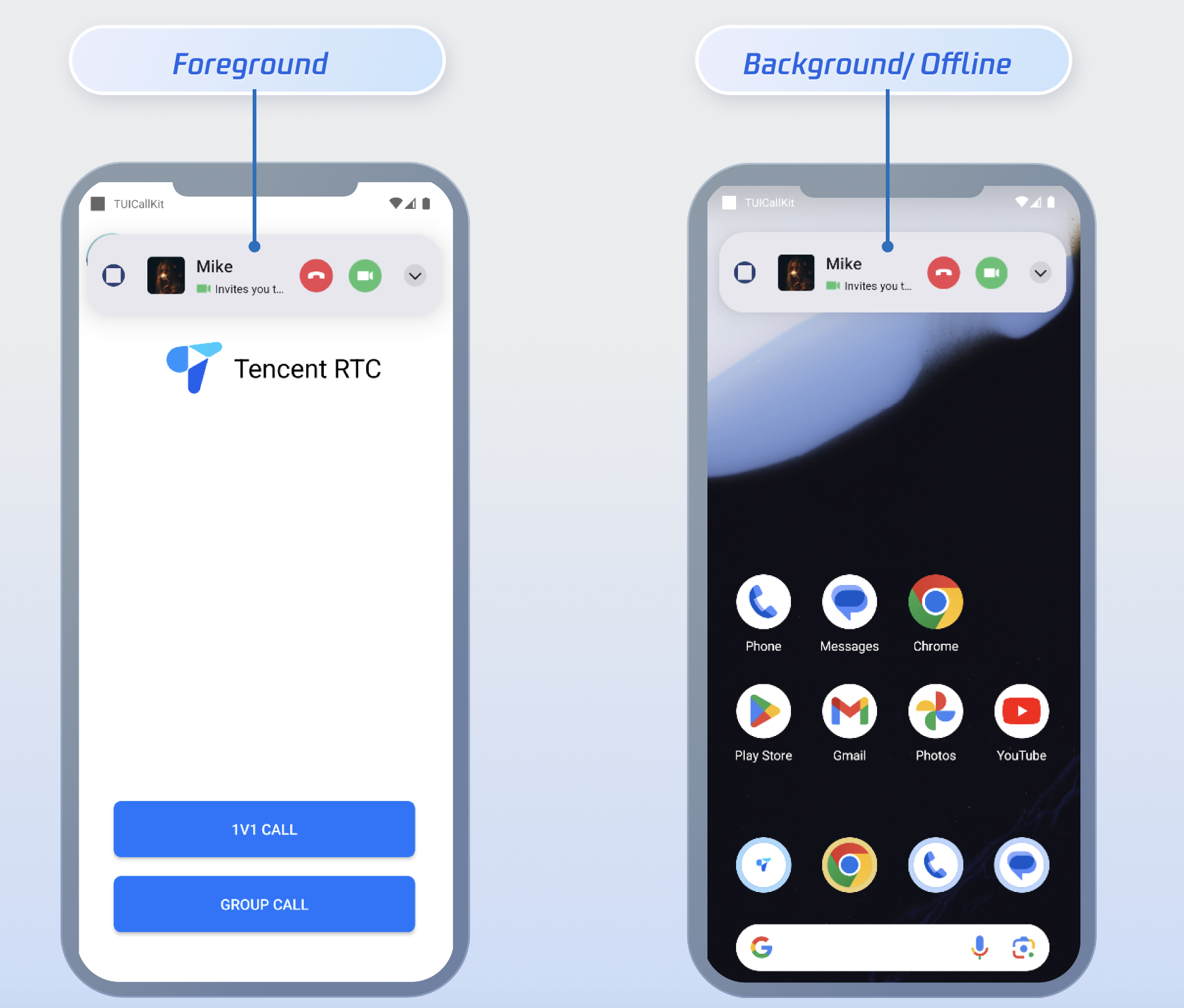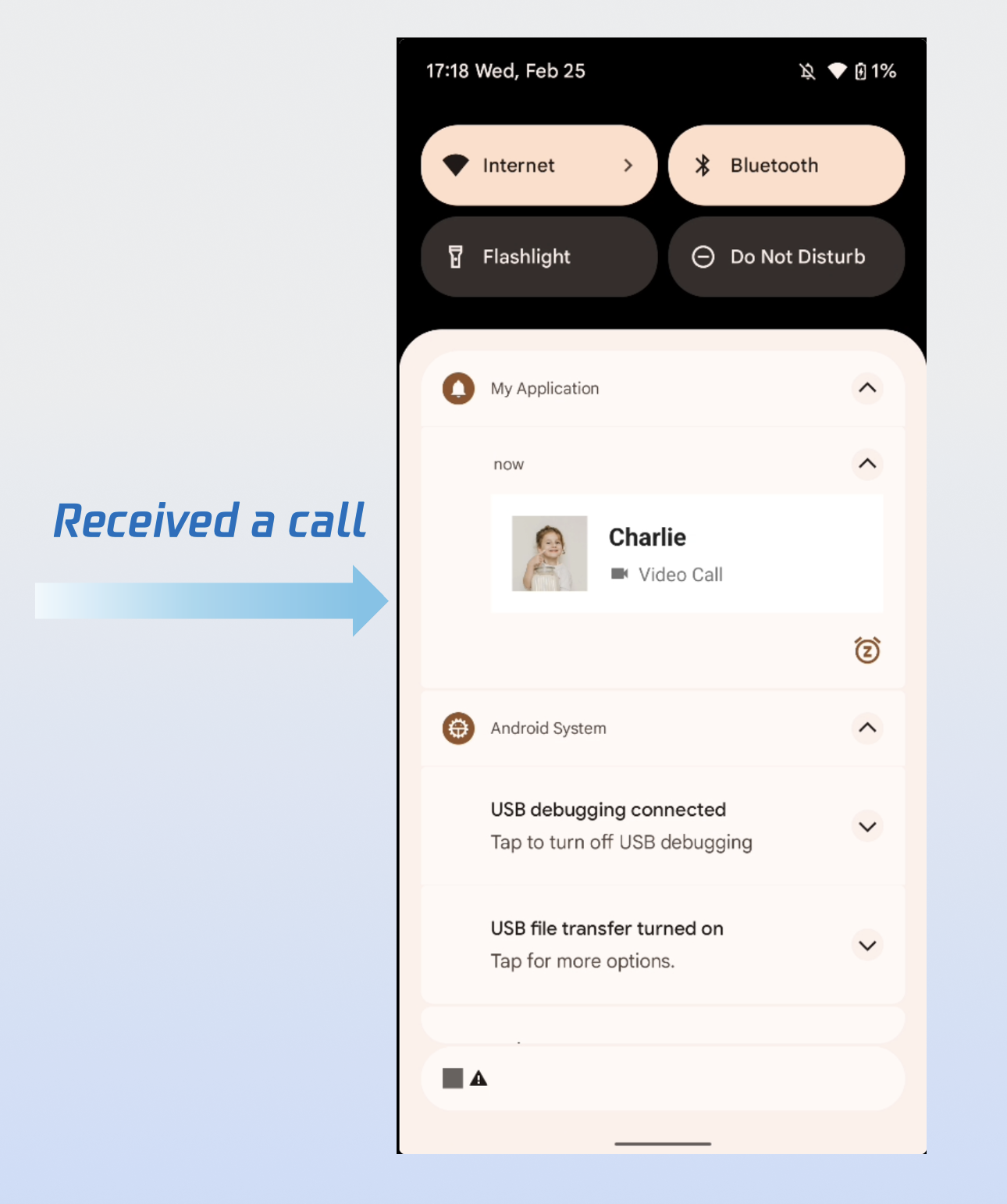 NotificationManager class to display a custom incoming call notification interface:IncomingCallNotificationManager): Encapsulate the logic for creating and displaying notifications.RemoteViews to define the notification layout. For details on configuring notifications with NotificationCompat.Builder (such as Channel, PendingIntent, priority, etc.), refer to the Android documentation: NotificationCompat.Builder.import android.app.Notificationimport android.app.NotificationChannelimport android.app.NotificationManagerimport android.content.Contextimport android.content.Intentimport android.os.Buildimport android.widget.RemoteViewsimport androidx.core.app.NotificationCompatclass IncomingCallNotificationManager(private val context: Context) {private val channelId = "incoming_call_channel"private val channelName = "Call notification"private val notificationId = 1001private var remoteViews: RemoteViews? = nullprivate val notificationManager: NotificationManager =context.getSystemService(Context.NOTIFICATION_SERVICE) as NotificationManagerinit {// 1.Create notification channelscreateNotificationChannel()}private fun createNotificationChannel() {if (Build.VERSION.SDK_INT >= Build.VERSION_CODES.O) {val channel = NotificationChannel(channelId, // Channel ID (Unique Identifier)"Call notification", // Channel Name (Visible to Users)NotificationManager.IMPORTANCE_HIGH // Importance: High priority).apply {description = "Display incoming call notification" // Channel descriptionenableLights(true) // Enable notification lightenableVibration(true) // Enable vibrationsetShowBadge(false) // Do not display badges}notificationManager.createNotificationChannel(channel)}}// 2. Display custom call notification UI stylefun showIncomingCallNotification(callerName: String,callerAvatar: Int?,isVideoCall: Boolean) {// RemoteViews are used to display custom layouts in notifications.remoteViews = RemoteViews(context.packageName, R.layout.incoming_call_notification)// Set caller nameremoteViews?.setTextViewText(R.id.tv_caller_name, callerName)// Set the call type description (video call or voice call).remoteViews?.setTextViewText(R.id.tv_call_desc, if (isVideoCall) "Video" else "Audio")// Set call type iconval callTypeIcon = if (isVideoCall) {R.drawable.ic_video_call} else {R.drawable.ic_audio_call}remoteViews?.setImageViewResource(R.id.img_call_type, callTypeIcon)// Set caller avatarremoteViews?.setImageViewResource(R.id.img_avatar, callerAvatar)// Create a notification objectval notification = NotificationCompat.Builder(context, channelId).setSmallIcon(R.drawable.ic_notification_small) // Small icons displayed in the status bar.setContent(remoteViews) // Set custom layout.setCustomContentView(remoteViews) // Standard view (when the notification bar is collapsed).setCustomBigContentView(remoteViews) // Expanded view (when the notification bar is expanded).setOngoing(false) // Continuous notification (cannot be swiped to delete).setAutoCancel(true) // Automatically cancel after tapping.setCategory(NotificationCompat.CATEGORY_CALL) // Category as call notification.setVisibility(NotificationCompat.VISIBILITY_PUBLIC) // Visible on lock screen.setTimeoutAfter(60000) // Automatically cancel after 60 seconds.build()notificationManager.notify(notificationId, notification)}}