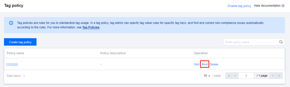 1. 必要に応じてTagポリシーを1つ選択し、操作列でバインドをクリックします。