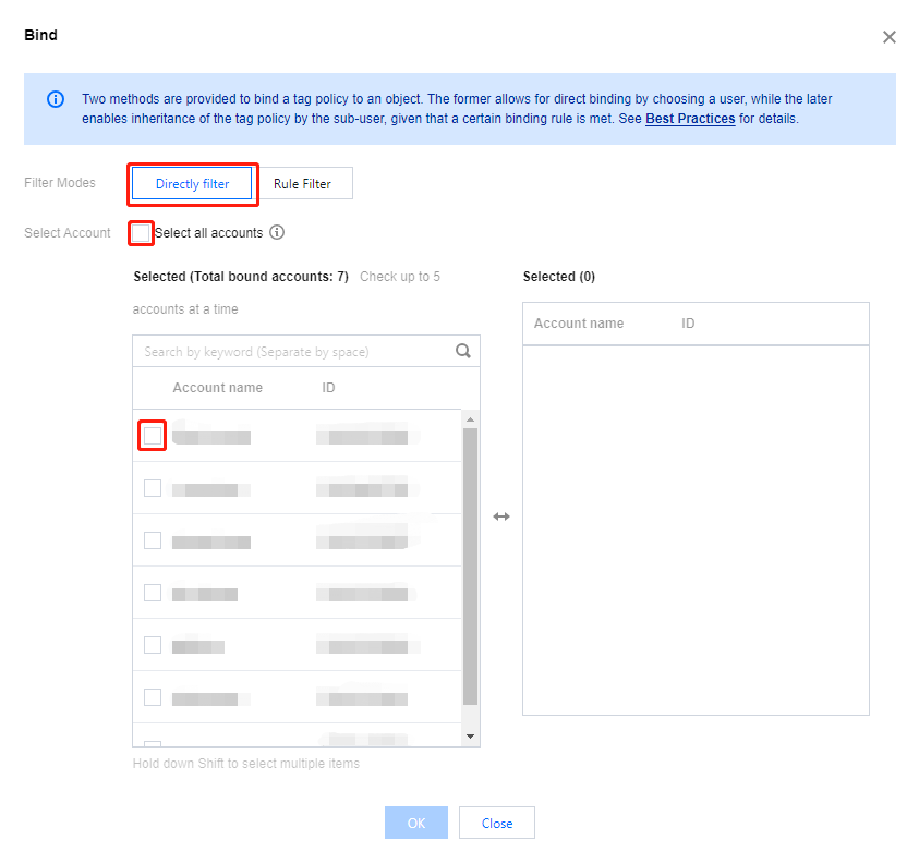 当フィルター方式が直接フィルタリング、すべてのアカウントを選択する場合、直接バインドすべてとして記録されます。