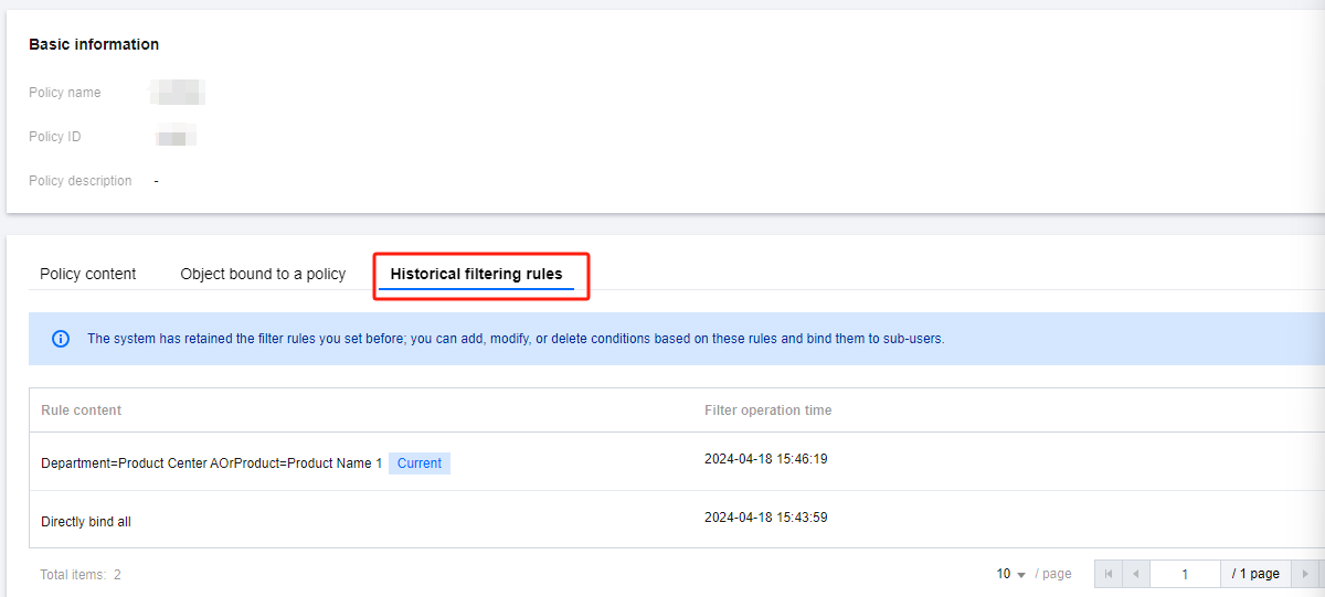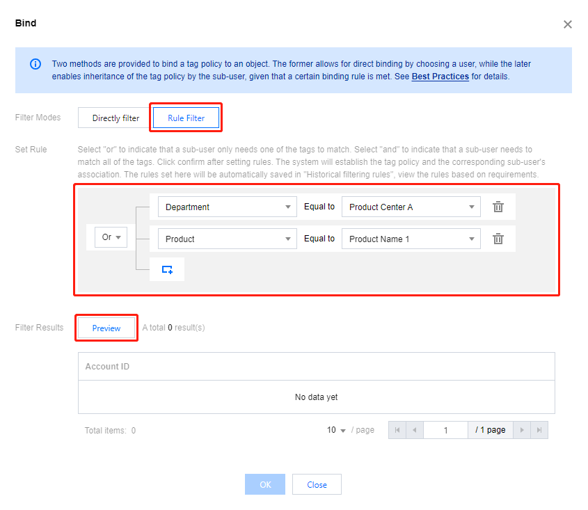 2番目のルールフィルタリング、あるフィルタリングルールを設定することで、そのルールに該当するサブユーザーがすべて抽出され、当該Tagポリシーにバインドされます。Tagポリシーをバッチごとにサブユーザーに適用する必要があるシナリオに適しています。例えば、サブユーザー数が非常に多い場合、最初に一部のサブユーザーをバインドし、その後別の部分のサブユーザーをバインドする必要があります。