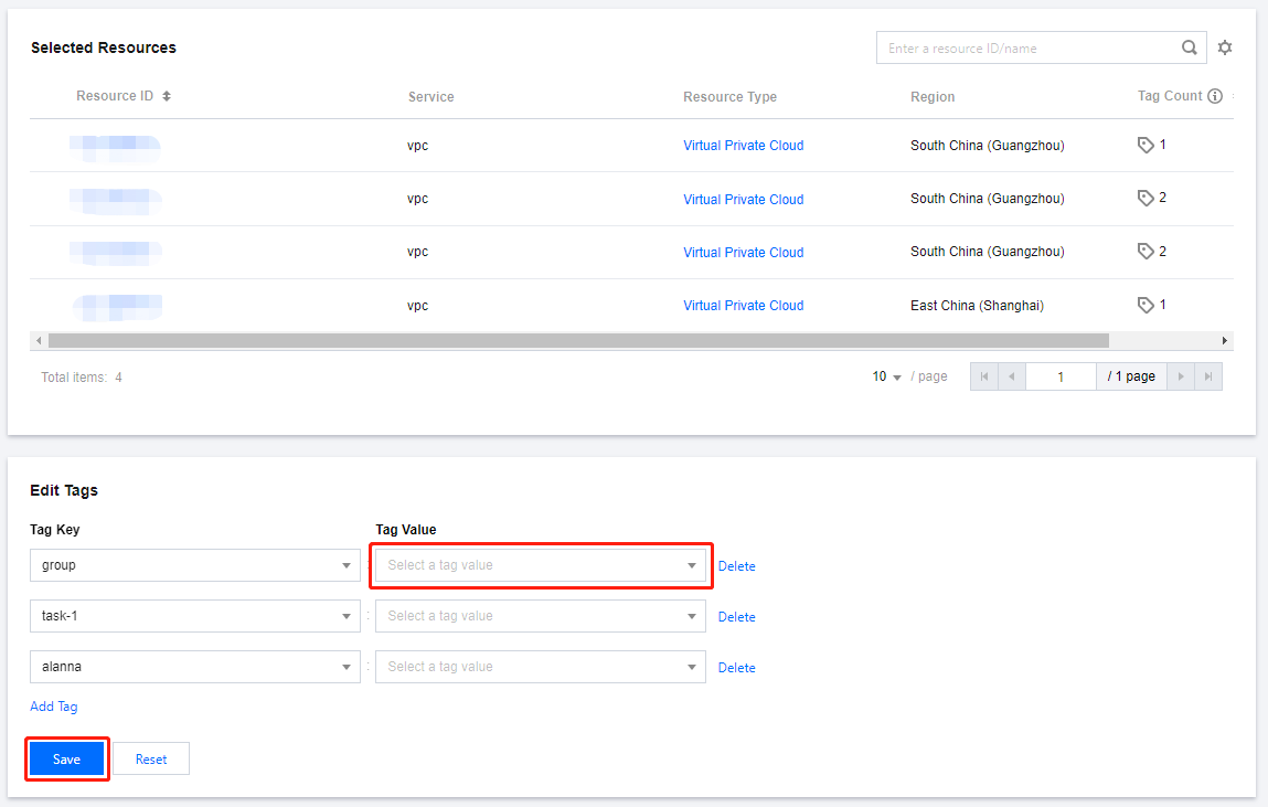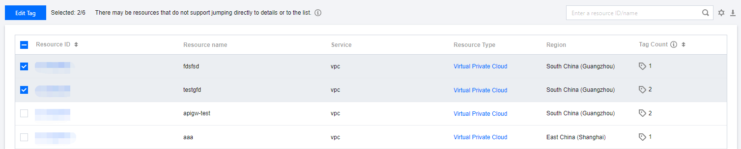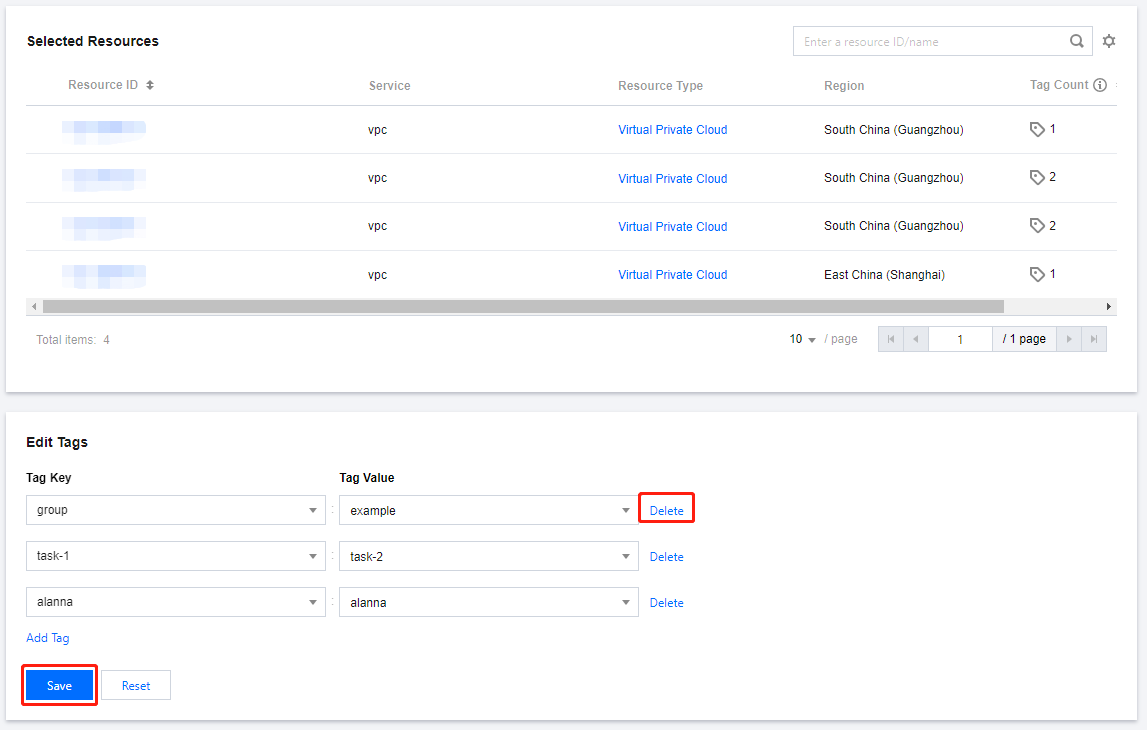 1. 選択したリソースTagの編集インターフェースで、対応するリソースTagを選択し、一つずつ削除をクリックした後、保存をクリックすると、一括アンバインドが実行されます。