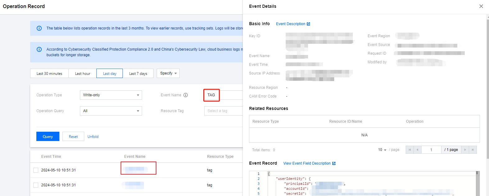 3. 具体的なイベントをクリックすると、右側にイベントの詳細情報が表示されます。 ここで、操作者とはイベントの操作者を指し、以下のいくつかの種類に分類されます: