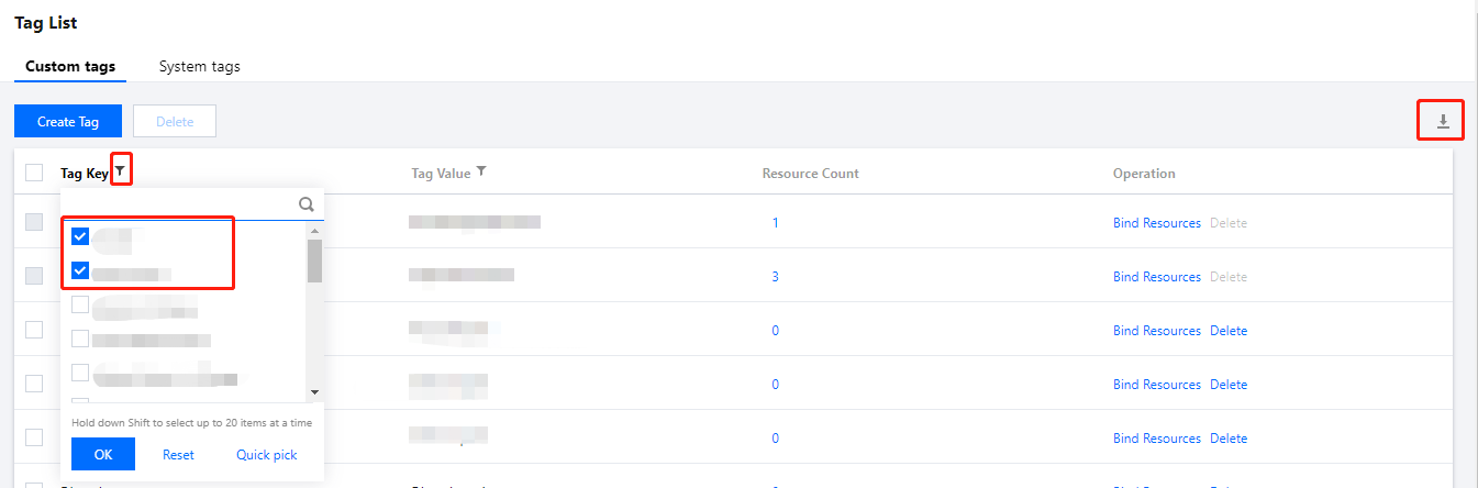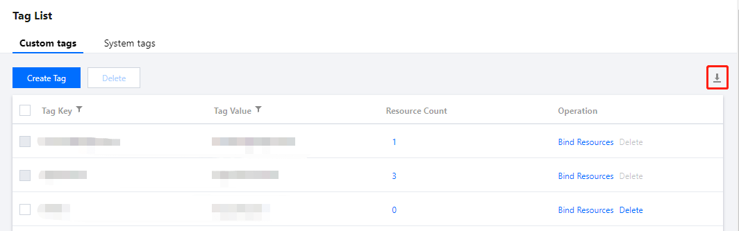 1. Tagコンソールにログインし、Tagリスト > カスタムTagタブに移動します。 2. エクスポートが必要なTagキー値を抽出します(1回で最大5万件エクスポート可能)。