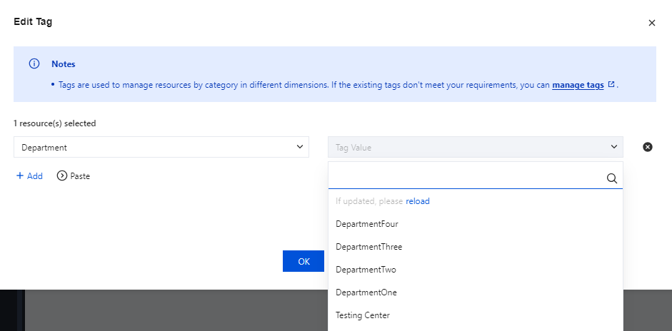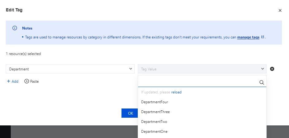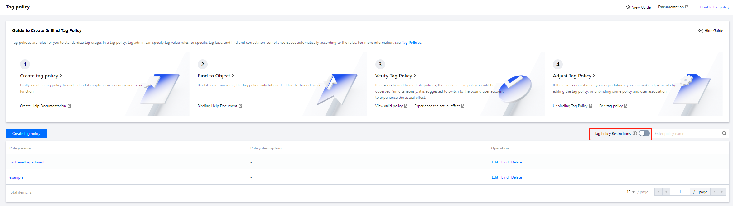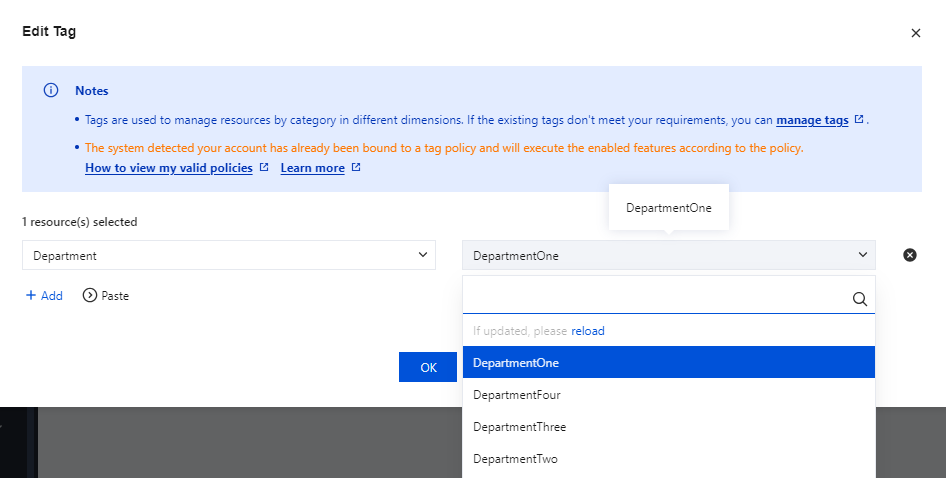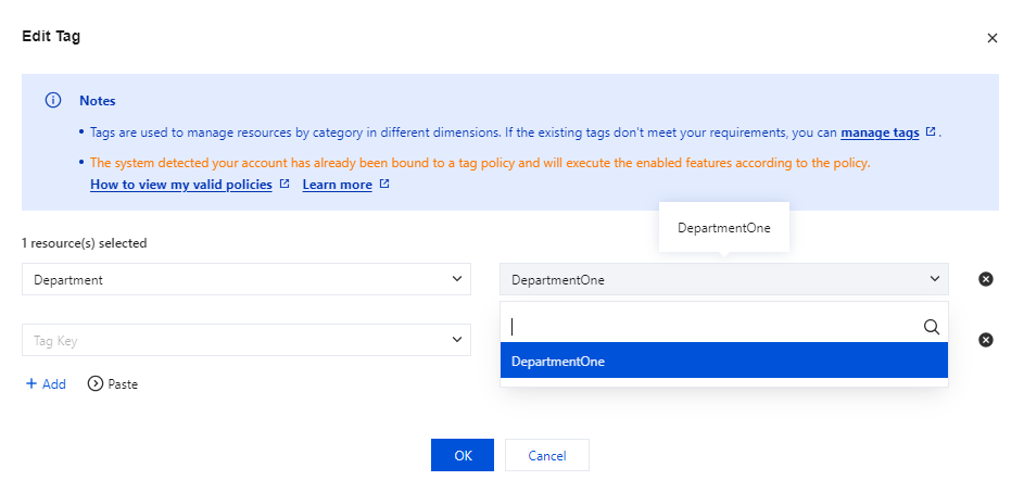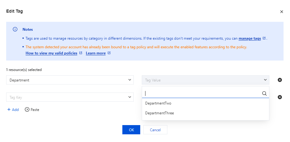 部署を設定する必要があります。部署:部署一のみ使用できます、サブユーザー2は部署:部署二と部署:部署三のみ使用できます。"auto_assign": {"@@assign": "on"}は、部署というTagキーが、サブユーザー1とサブユーザー2の両方に対して自動割り当てが設定されていることを示します。"auto_assign_value": {"@@assign": "on"}は、サブユーザー1にTag値の自動割り当てを設定したことを示します。これは、そのTag値が唯一であり、手動選択が不要であるためです。一方、サブユーザー2の部署Tag値は唯一ではないため、サブユーザー2が自身で選択する必要があり、したがってポリシーでは設定されません。{"tags": {"部門": {"tag_key": {"@@assign": "部署"},"tag_value": {"@@assign": [部署一]},"resource_type_scope": {"@@assign": ["*"]},"auto_assign": {"@@assign": "on"},"auto_assign_value": {"@@assign": "on"}}}}