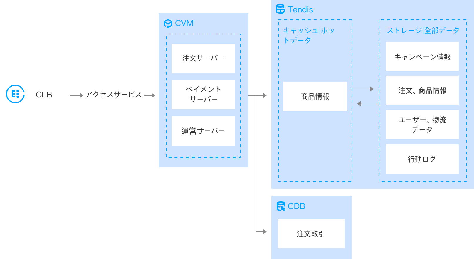 eコマースアプリケーションはつねに大量のアイテムデータを持っています。TencentDB for Tendisを使用すると、メモリ容量の制限を容易に突破し、サービスコストを大幅に削減できます。通常のサービス要求では、アクティブな商品データはメモリから読み取られ、アクティブでないアイテムデータはディスクから読み取られるため、メモリ不足のトラブルを回避できます。