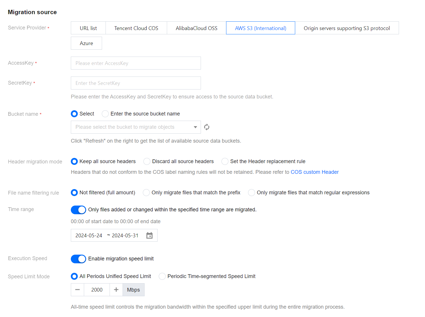 Execution Speed, Speed Limit Mode: All public cloud object storage services have speed limits. To ensure business stability, please confirm with the service provider and set the maximum available migration bandwidth in Mbps before migrating.