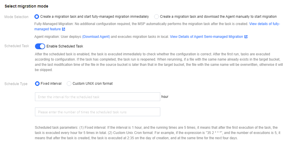 Create a migration task and download the Agent manually to start migration: When semi-managed migration is used, only task creation is completed after you click "Create and Start". You need to manually download the Agent and deploy it on the origin server before you can start the migration. For Agent deployment, see Using Semi-Managed Migration Agent. Scheduled Task: Scheduled tasks can be executed repeatedly to synchronize incremental files in the source bucket. Such tasks are executed immediately for the first time and can be triggered later either after a specified interval or according to the scheduling rules set in Custom UNIX cron format. When a scheduled task is executed again, files with the same name as those in the destination bucket will be skipped. In other words, existing files with the same name in the destination bucket are retained, which means that only incremental files are synchronized.