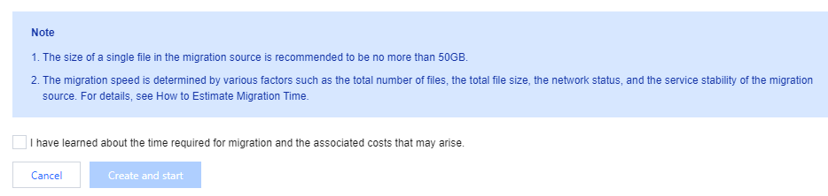 The migration speed is subject to the lowest speed at each stage of the migration process and is affected by the network transmission speed and maximum concurrency level. For more details, see Estimating File Migration Time.