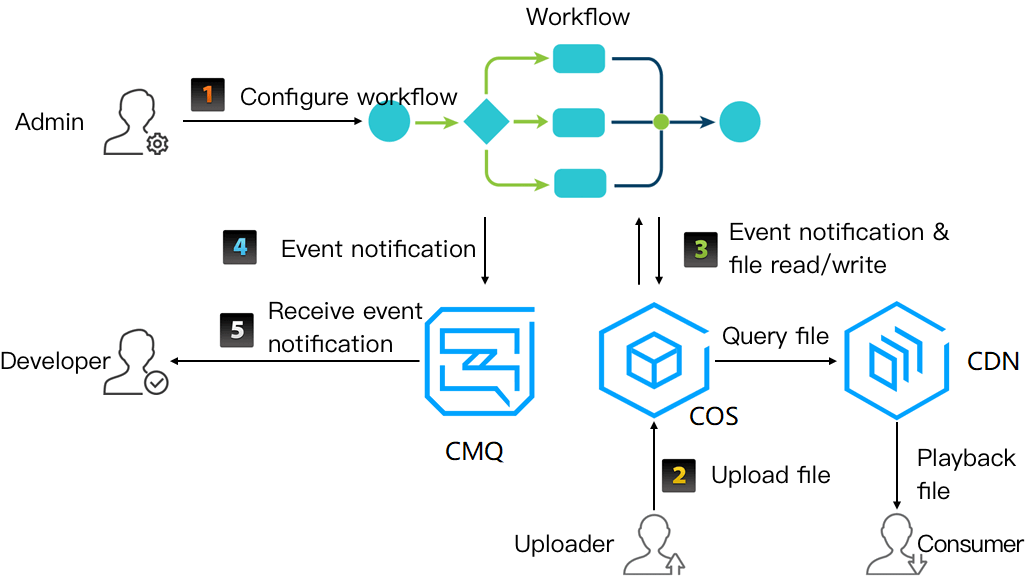 MPS를 예로 들면 워크플로에는 주로 워크플로 구성, 트랜스코딩 트리거, 트랜스코딩 작업 처리 및 이벤트 알림 보내기 등이 포함됩니다. 워크플로는 다음과 같습니다. 기능 지원