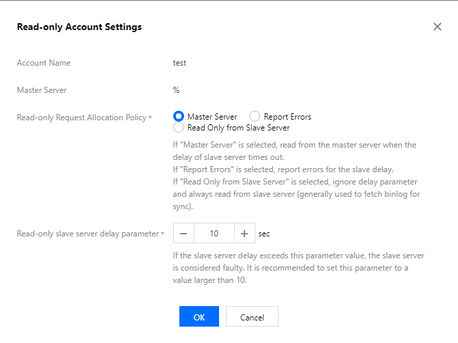4. 팝업 창에서 읽기 전용 요청 할당 정책을 설정하여 보조 서버 장애(또는 긴 지연) 발생 시 읽기 정책을 정의하고 읽기 전용 보조 서버 지연 매개변수를 구성한 다음 확인을 클릭합니다.
