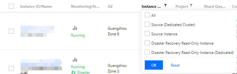 재해 복구/읽기 전용 인스턴스가 있는 리전에서 보고, 인스턴스 목록에서 필터링할 수 있습니다.
