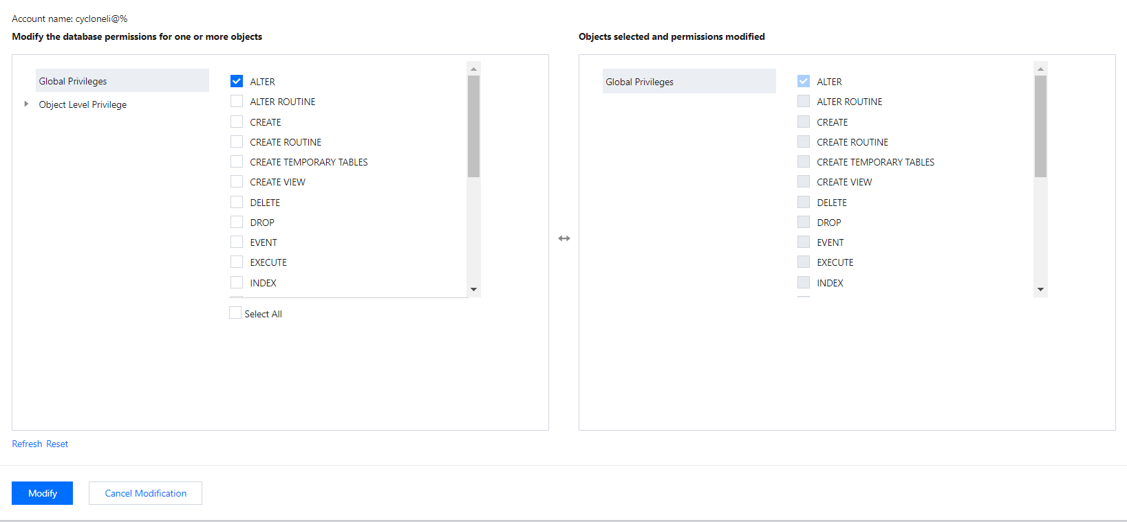 콘솔에서 TDSQL for MySQL 계정에 대한 전역/객체 레벨 권한을 부여할 수 있습니다.
