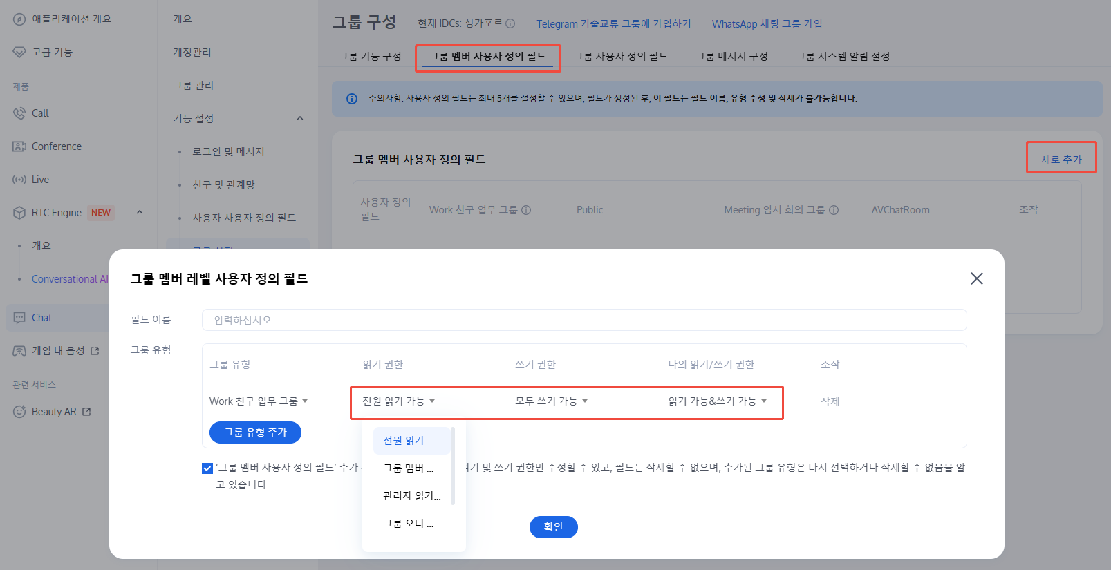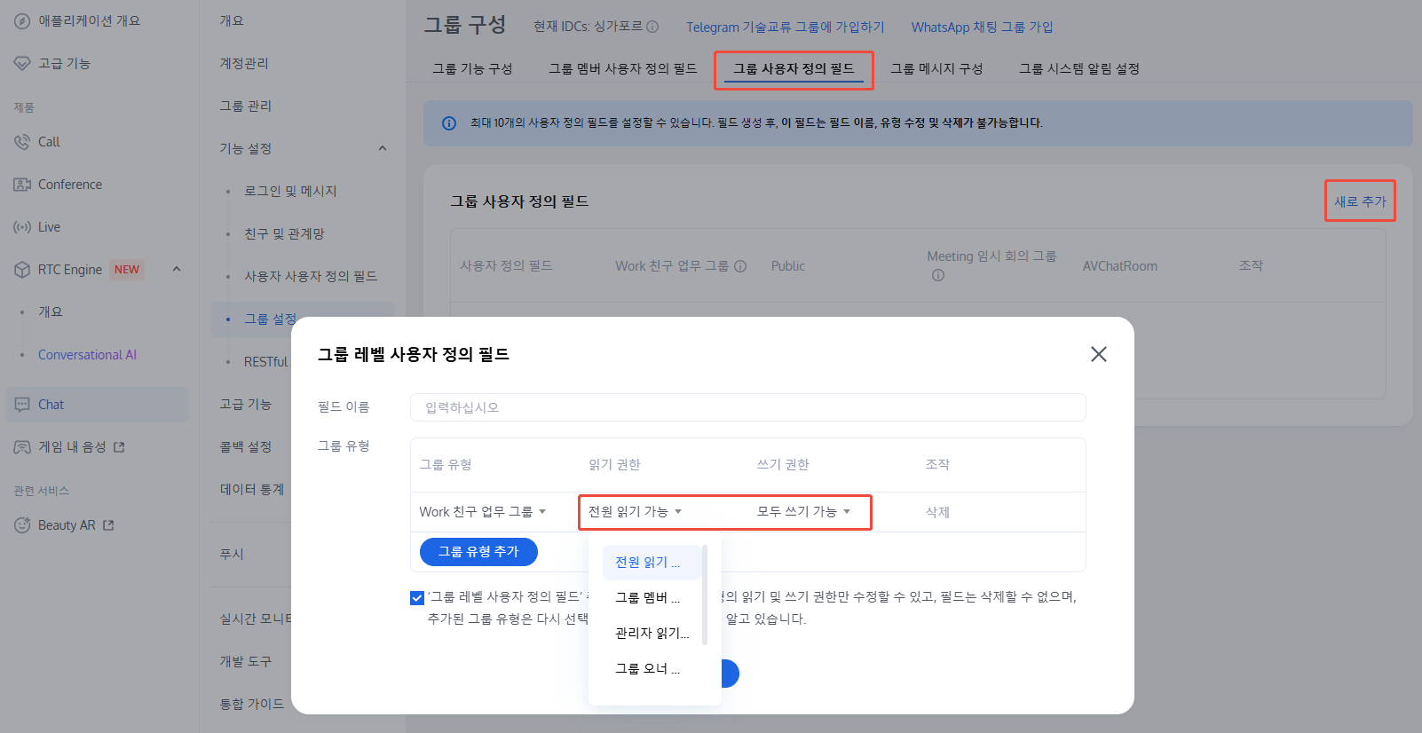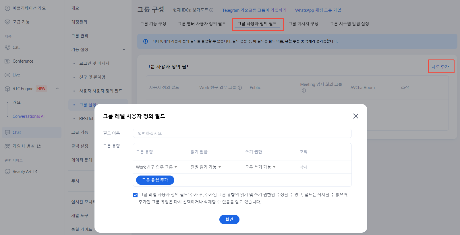 그룹 사용자 정의 필드는 최대 10개까지 추가할 수 있습니다. 이 필드는 그룹 유형 및 해당 읽기 및 쓰기 권한 변경만 가능하며, 삭제는 불가능합니다. 비즈니스 니즈에 따라 합리적으로 필드를 구성하십시오.