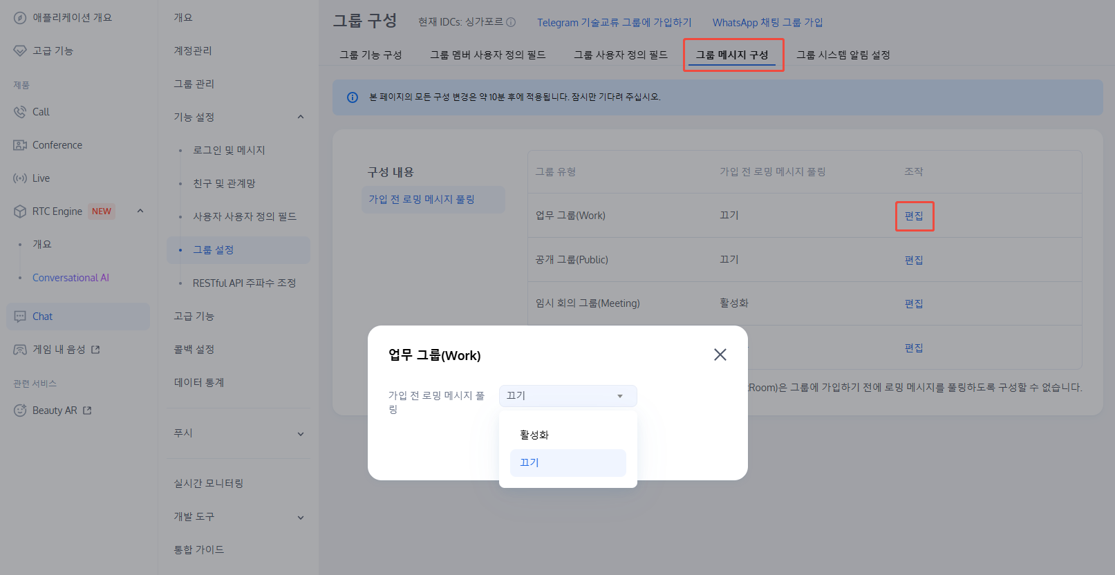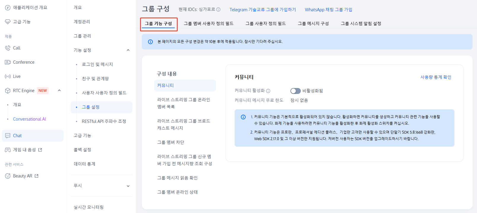 Chat 콘솔에 로그인하여 대상 애플리케이션 섹션을 클릭하고 왼쪽 사이드바에서 기능 설정>그룹 설정>그룹 기능 설정을 선택하여 비즈니스 니즈에 따라 그룹 기능을 설정할 수 있습니다. 커뮤니티