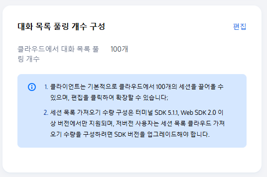 대화 목록 가져오기 수 설정은 단말 SDK 5.1.1, Web SDK 2.0 및 상위 버전만 지원하며, 하위 버전 사용자가 설정해야 하는 경우 SDK 버전을 업그레이드하십시오.
