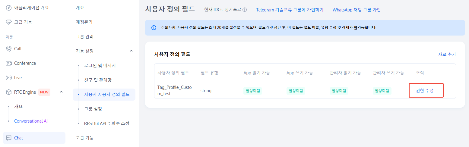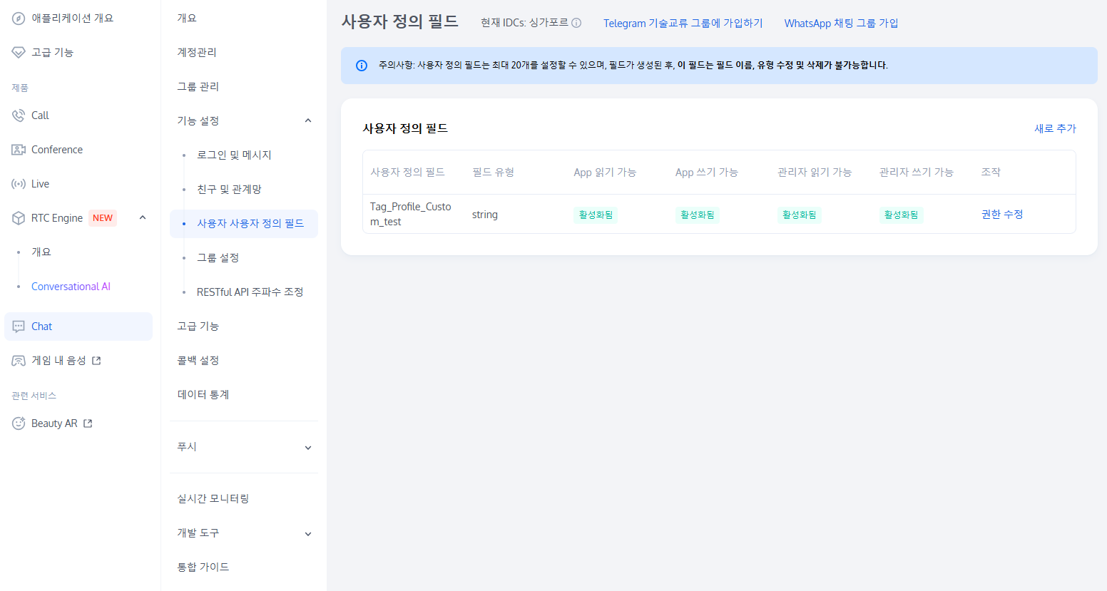 Chat 콘솔에 로그인하여 대상 애플리케이션 카드를 클릭하고 왼쪽 사이드바에서 기능 설정>유저 사용자 정의 필드를 선택하여 비즈니스 니즈에 따라 유저 사용자 정의 필드를 관리할 수 있습니다. 주의: