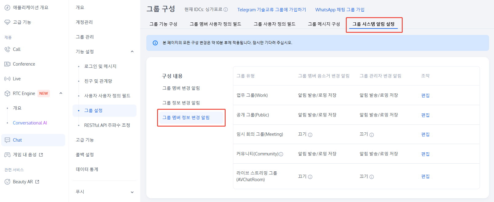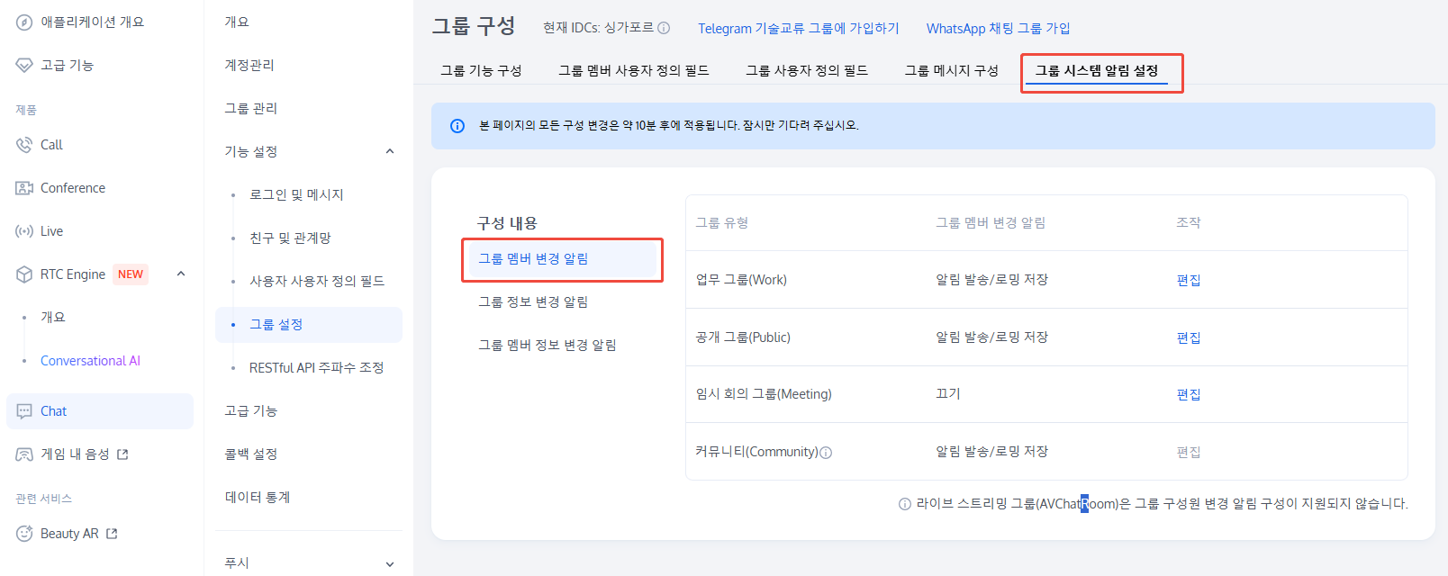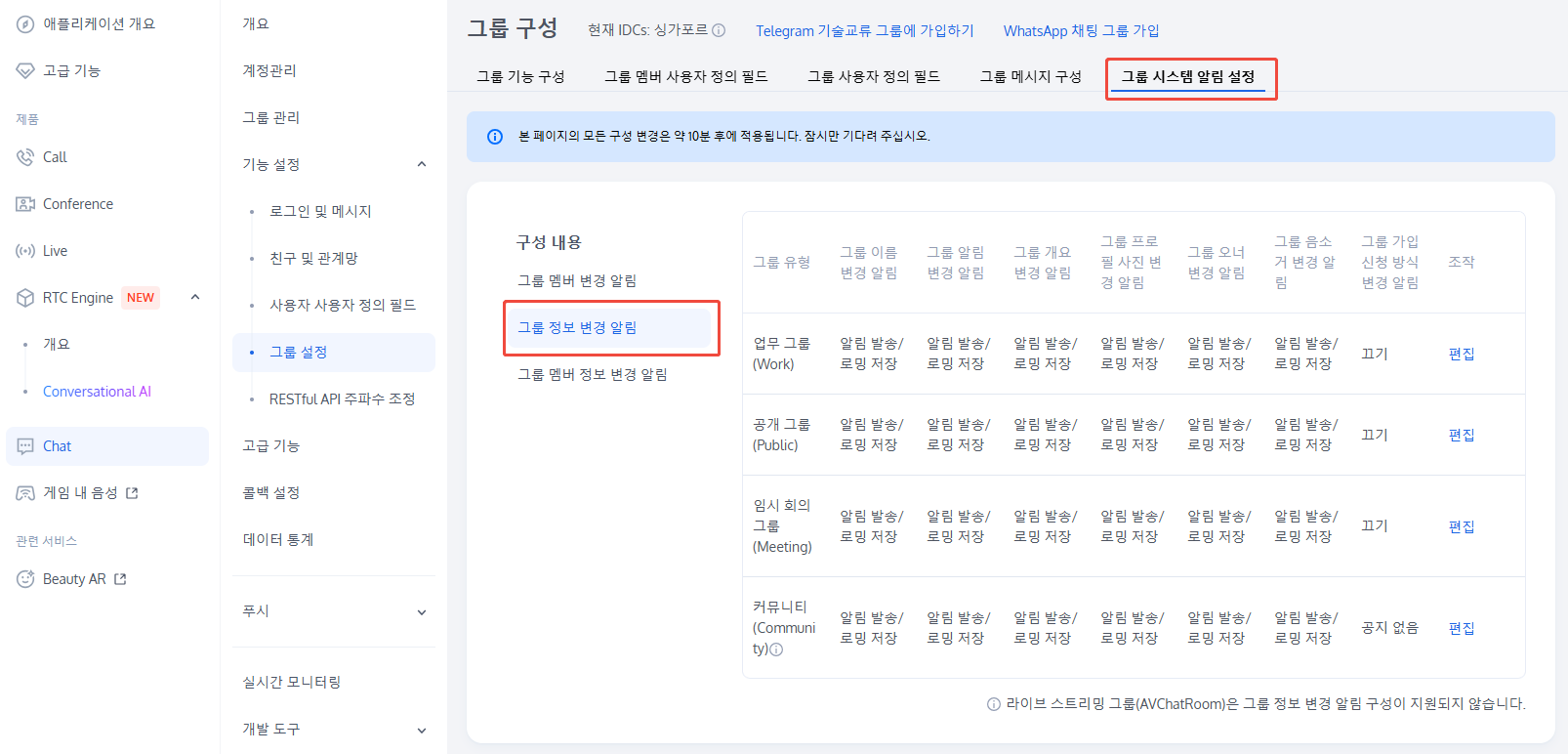 라이브 방송 그룹(AVChatRoom)은 그룹 프로필 정보 변경 알림 설정이 지원되지 않습니다.