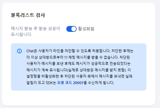 활성화: 상대방이 나의 계정을 블록리스트에 추가한 경우 상대방에게 1:1 채팅 메시지를 보낼 때 메시지 발송 성공 메시지가 표시되지만 상대방은 메시지를 받지 못합니다. 이는 기본 설정 값입니다.